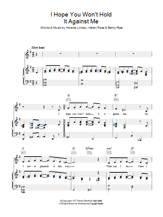 Download or print Benny Ross I Hope You Won't Hold It Against Me sheet music, chords and digital score arranged for Piano, Vocal & Guitar Chords. This Standards score includes 4 page(s).
