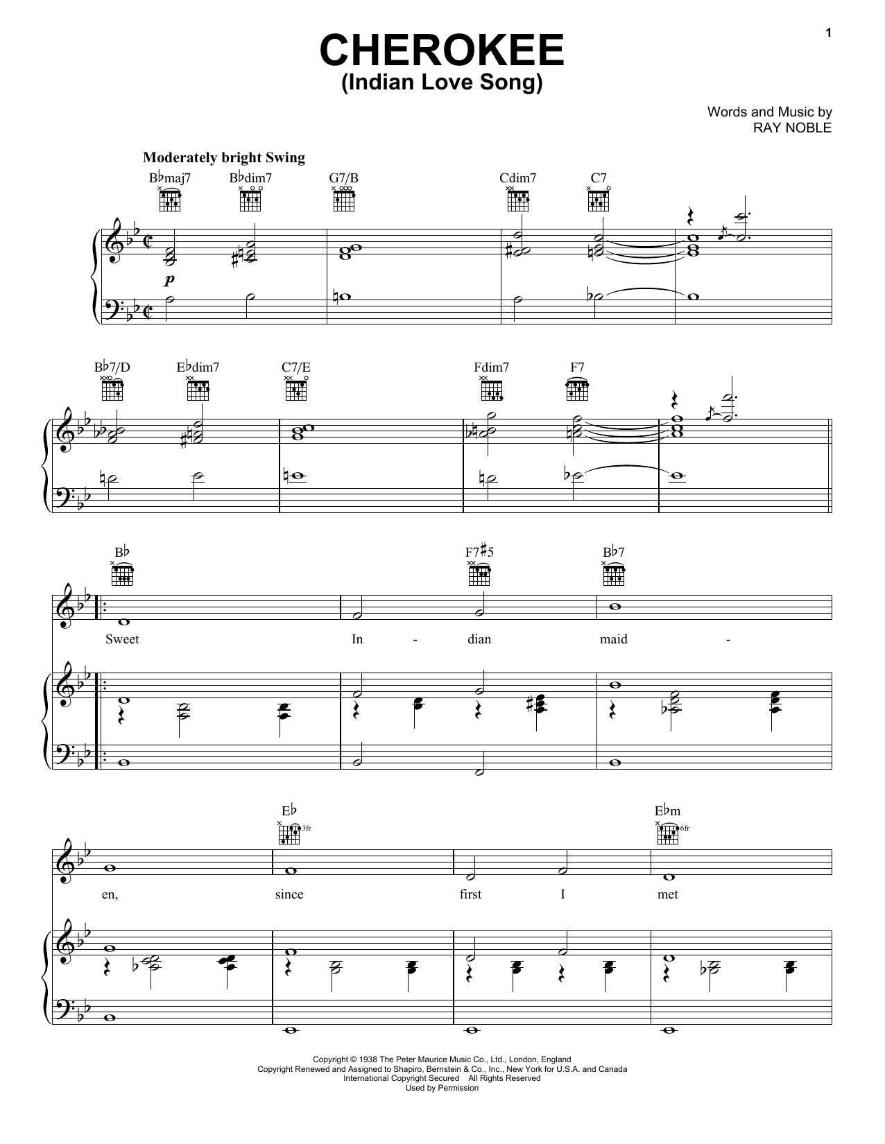 Download or print Benny Sextet Goodman Cherokee (Indian Love Song) sheet music, chords and digital score arranged for Piano, Vocal & Guitar Chords (Right-Hand Melody). This Jazz score includes 5 page(s).