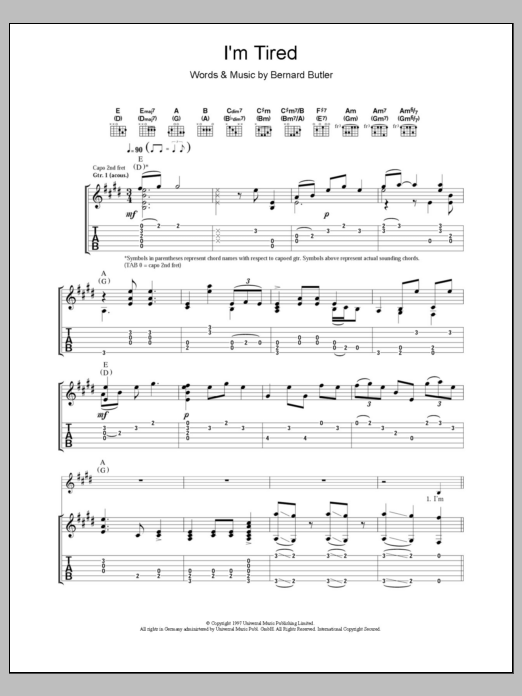 Download or print Bernard Butler I'm Tired sheet music, chords and digital score arranged for Guitar Tab. This Rock score includes 6 page(s).