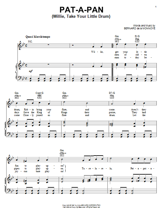 Download or print Bernard de la Monnoye Pat-A-Pan (Willie, Take Your Little Drum) sheet music, chords and digital score arranged for Educational Piano. This Children score includes 3 page(s).