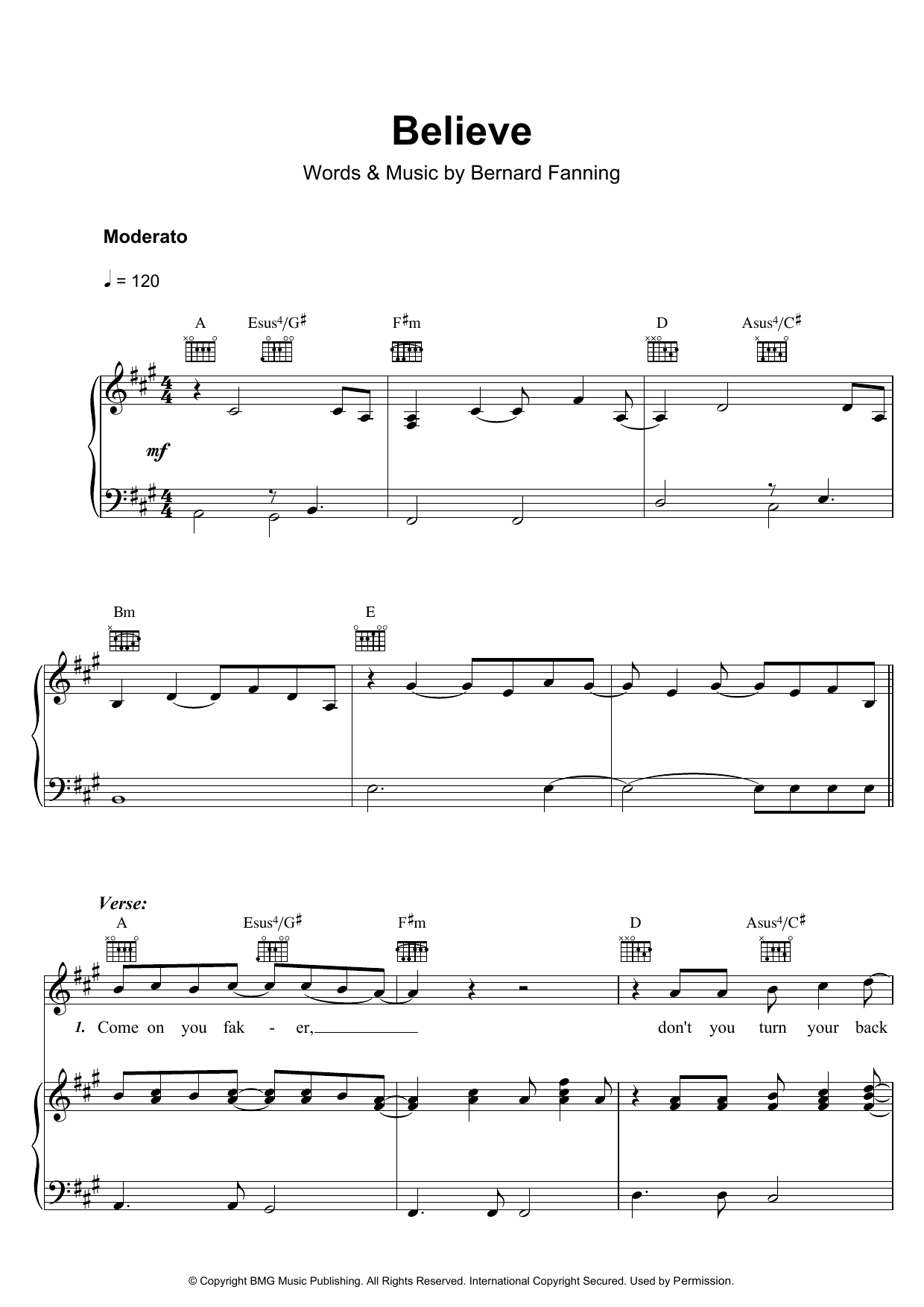 Download or print Bernard Fanning Believe sheet music, chords and digital score arranged for Piano, Vocal & Guitar Chords. This Rock score includes 5 page(s).