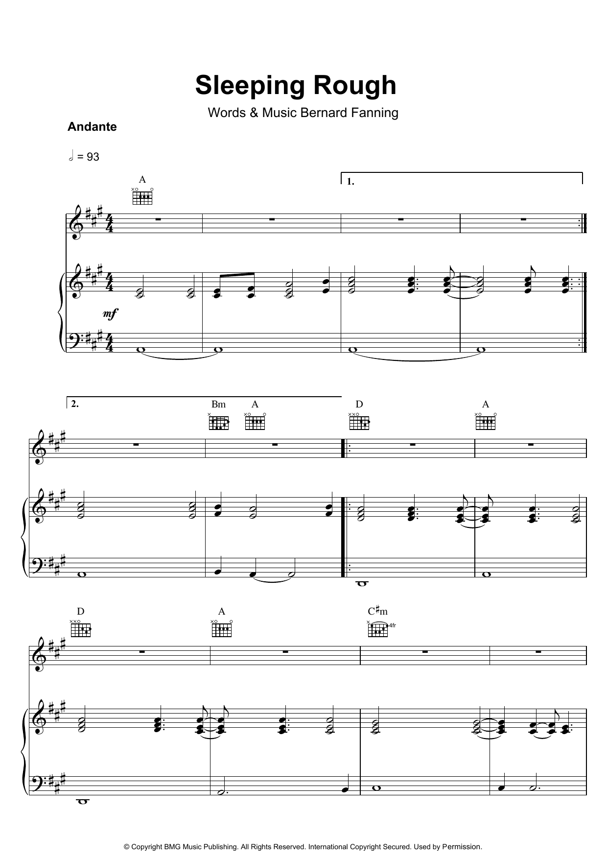 Download or print Bernard Fanning Sleeping Rough sheet music, chords and digital score arranged for Piano, Vocal & Guitar Chords. This Rock score includes 7 page(s).