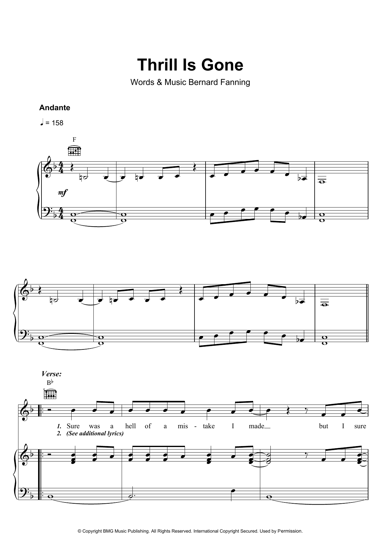 Download or print Bernard Fanning Thrill Is Gone sheet music, chords and digital score arranged for Piano, Vocal & Guitar Chords. This Rock score includes 5 page(s).