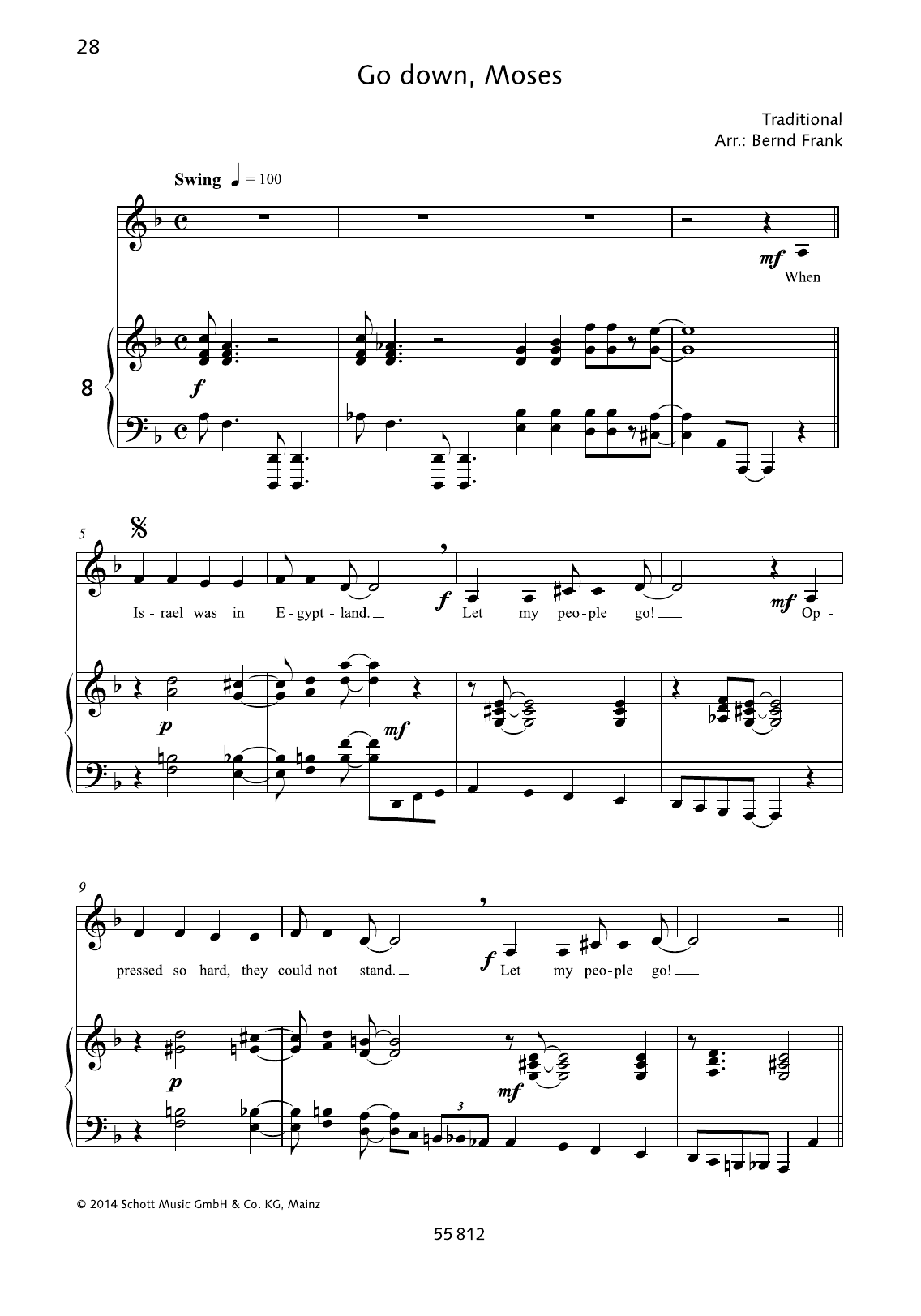 Download or print Bernd Frank Go Down, Moses sheet music, chords and digital score arranged for Piano & Vocal. This Gospel score includes 2 page(s).