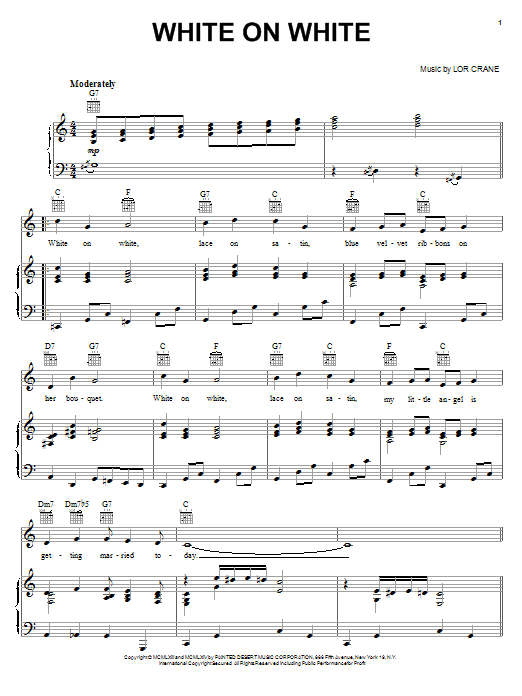 Download or print Bernice Ross White On White sheet music, chords and digital score arranged for Piano, Vocal & Guitar Chords (Right-Hand Melody). This Pop score includes 3 page(s).