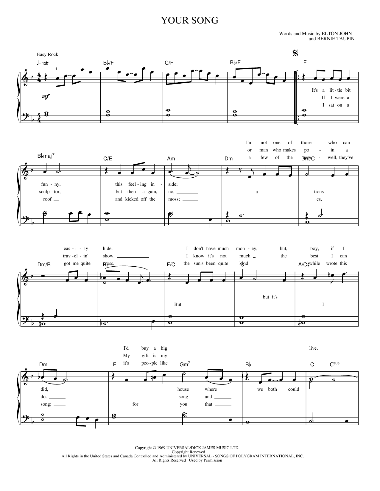Download or print Bernie Taupin Your Song sheet music, chords and digital score arranged for Piano, Vocal & Guitar Chords (Right-Hand Melody). This Pop score includes 3 page(s).