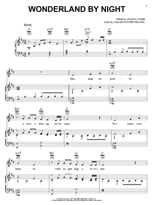 Download or print Bert Kaempfert Wonderland By Night sheet music, chords and digital score arranged for Piano, Vocal & Guitar Chords (Right-Hand Melody). This Pop score includes 4 page(s).