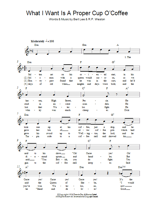 Download or print Bert Lee What I Want Is A Proper Cup O'Coffee sheet music, chords and digital score arranged for Lead Sheet / Fake Book. This Standards score includes 2 page(s).