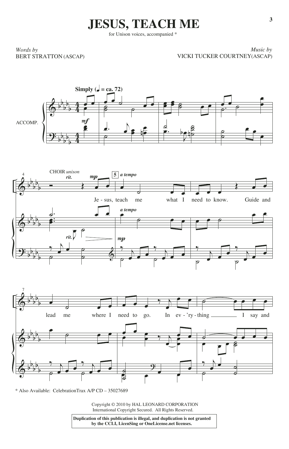 Download or print Bert Stratton and Vicki Tucker Courtney Jesus, Teach Me sheet music, chords and digital score arranged for Unison Choir. This Collection score includes 5 page(s).