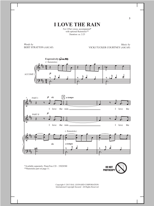 Download or print Bert Stratton I Love The Rain sheet music, chords and digital score arranged for 2-Part Choir. This Concert score includes 10 page(s).