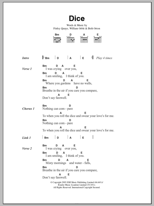 Download or print Beth Orton Dice sheet music, chords and digital score arranged for Guitar Chords/Lyrics. This Pop score includes 2 page(s).