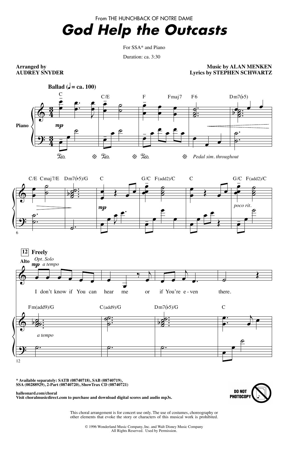 Download or print Bette Midler God Help The Outcasts (from The Hunchback Of Notre Dame) (arr. Audrey Snyder) sheet music, chords and digital score arranged for SAB Choir. This Disney score includes 9 page(s).