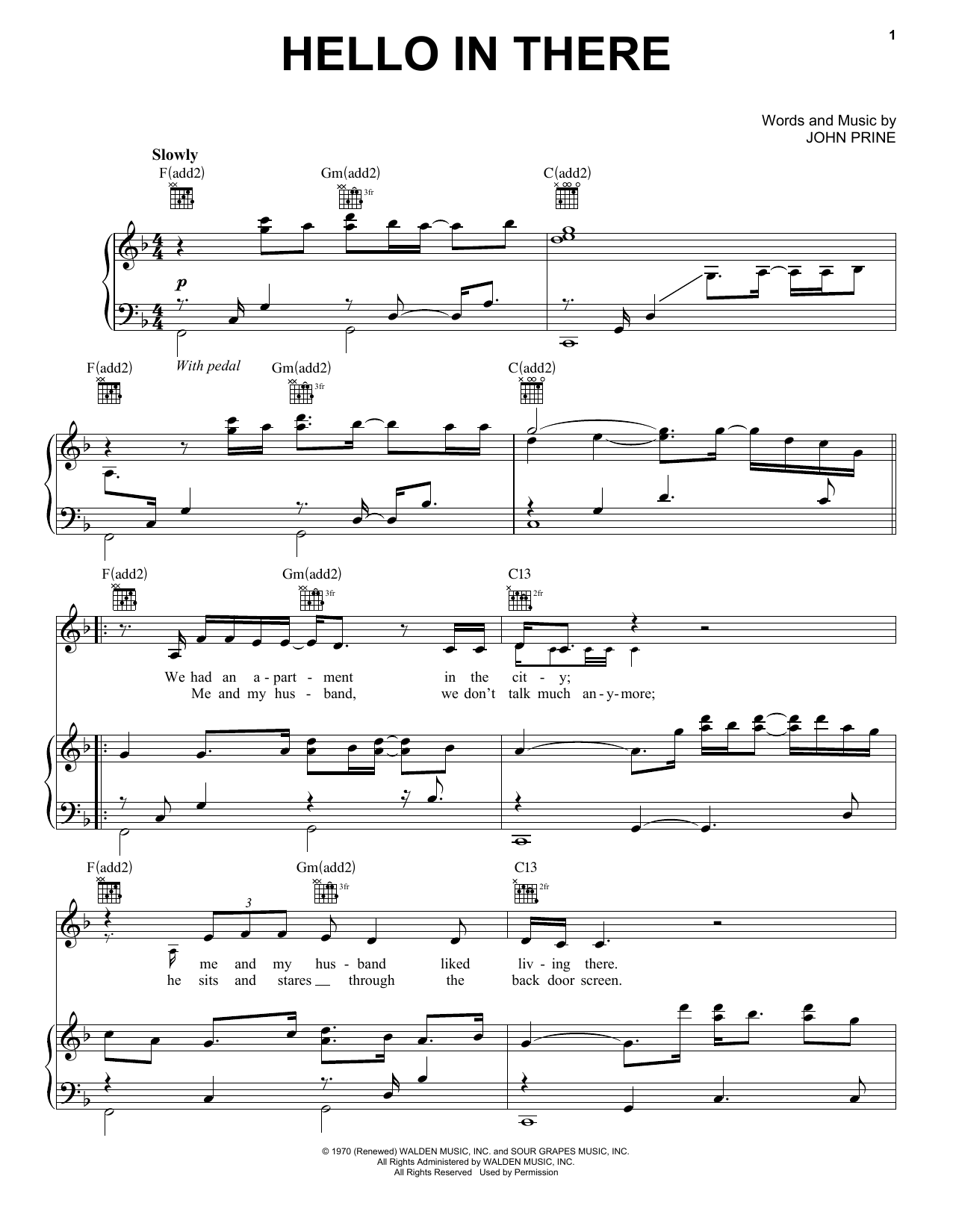 Download or print Bette Midler Hello In There sheet music, chords and digital score arranged for Piano & Vocal. This Pop score includes 5 page(s).