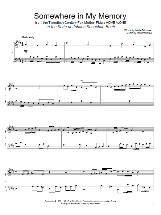 Download or print John Williams Somewhere In My Memory (from Home Alone) (in the style of J.S. Bach) (arr. David Pearl) sheet music, chords and digital score arranged for Piano Solo. This Christmas score includes 2 page(s).