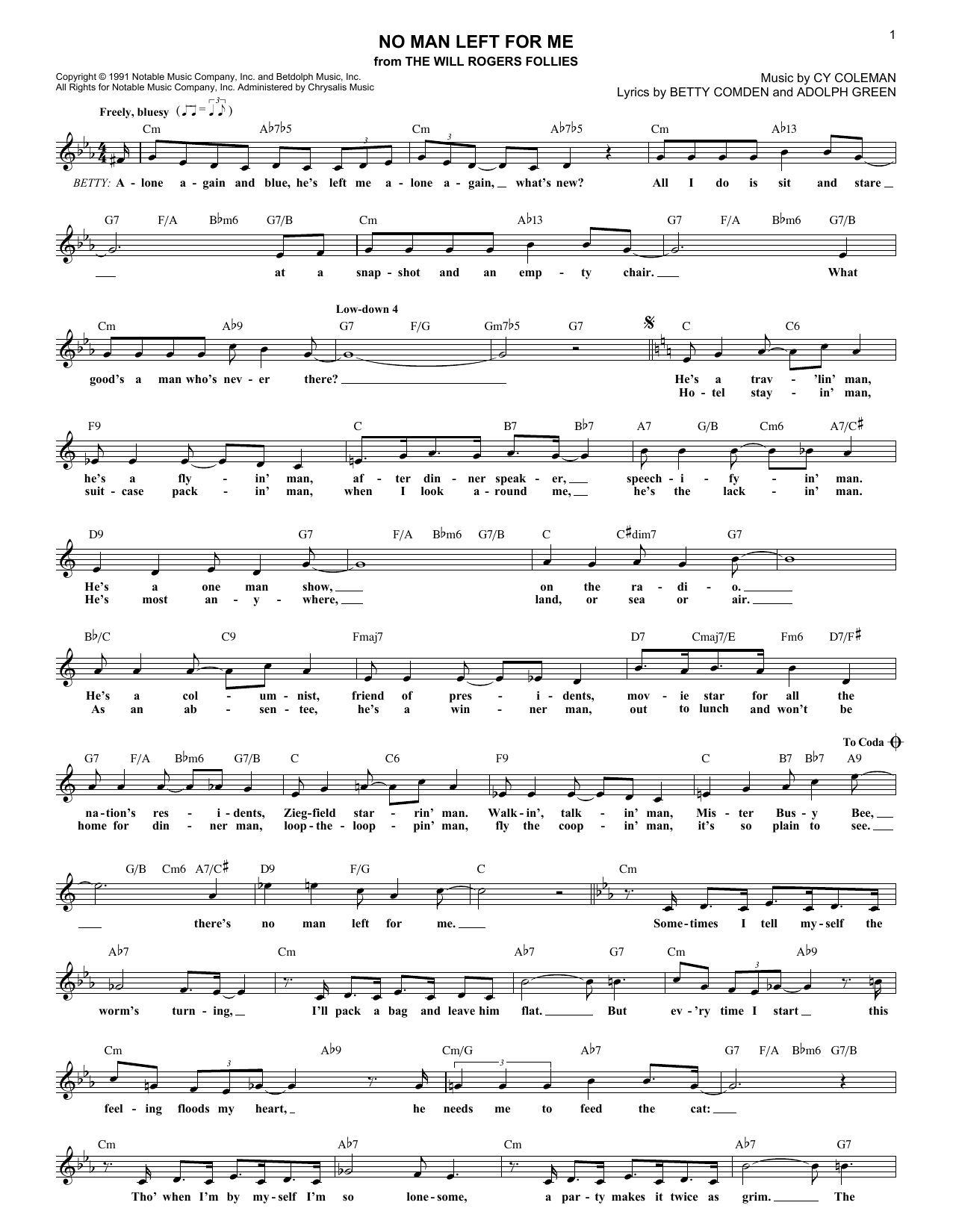 Download or print Betty Comden No Man Left For Me sheet music, chords and digital score arranged for Lead Sheet / Fake Book. This Musical/Show score includes 2 page(s).