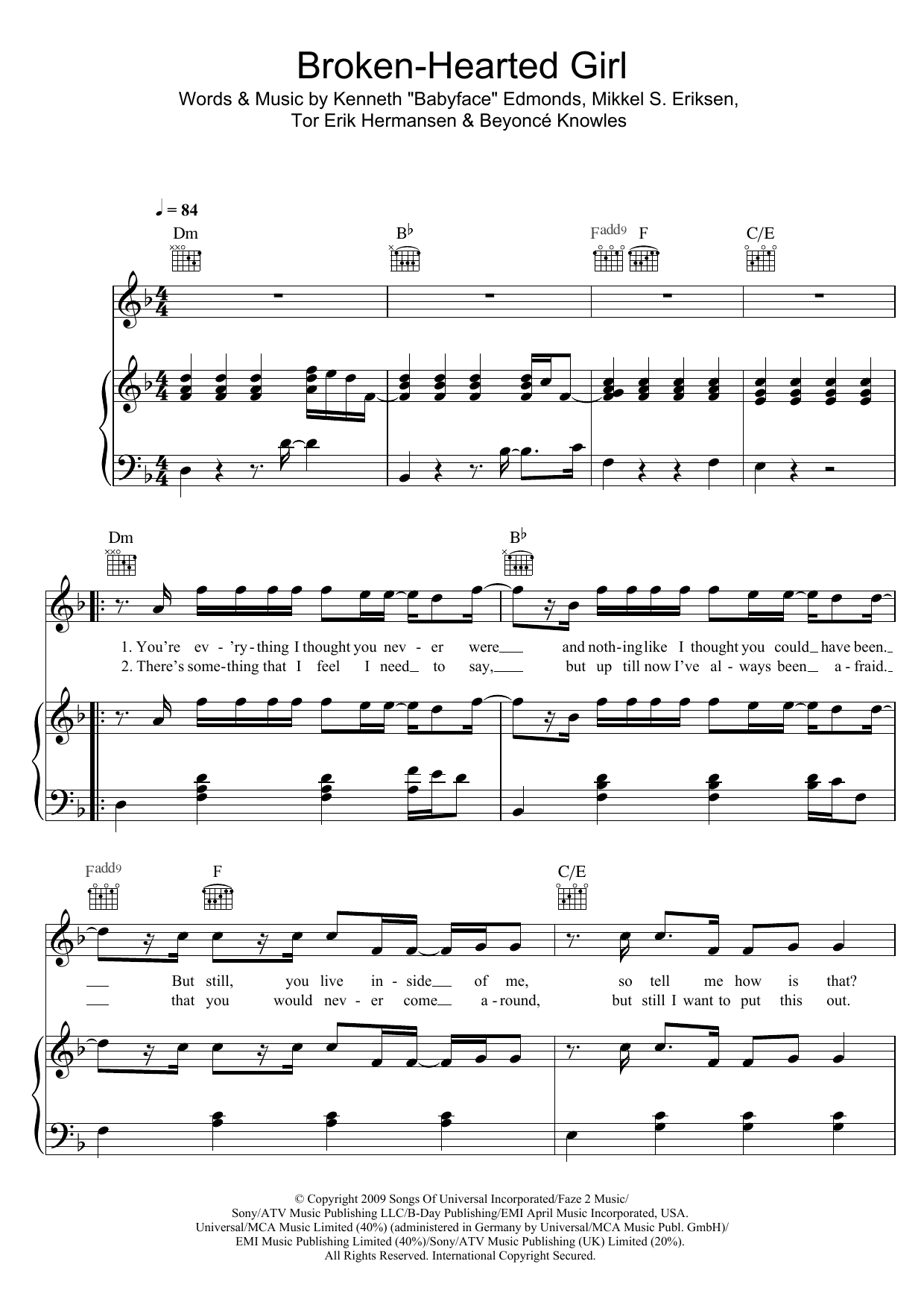 Download or print Beyonce Broken-Hearted Girl sheet music, chords and digital score arranged for Piano, Vocal & Guitar Chords (Right-Hand Melody). This Pop score includes 7 page(s).