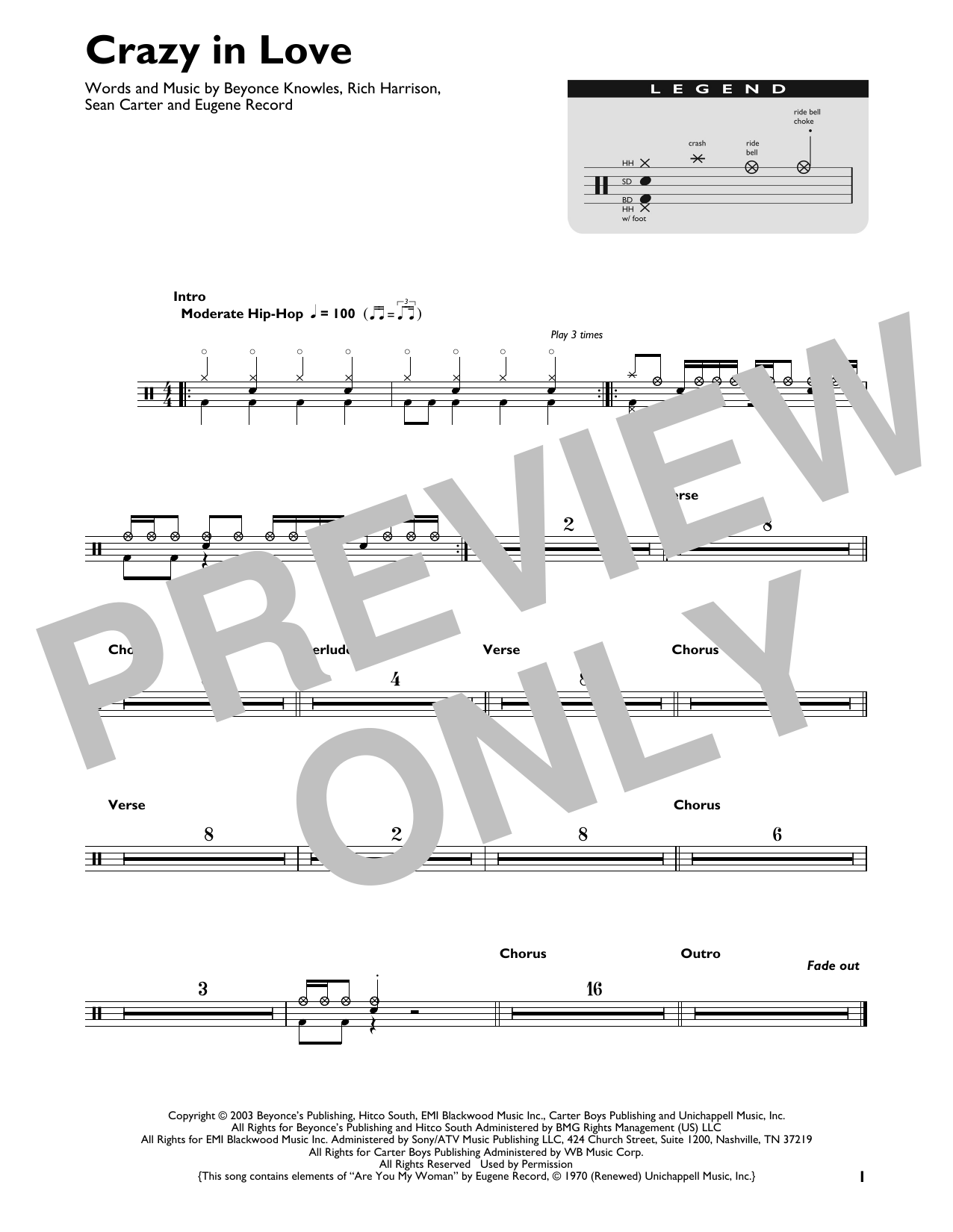 Download or print Beyoncé Crazy In Love (feat. Jay-Z) sheet music, chords and digital score arranged for Drum Chart. This Pop score includes 3 page(s).