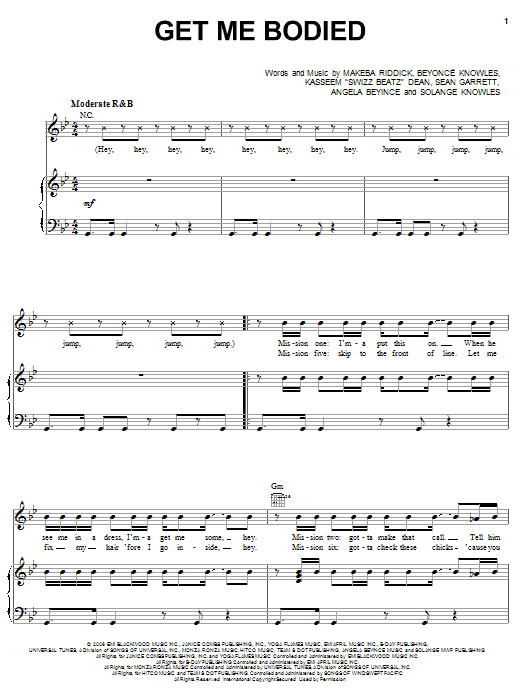Download or print Beyonce Get Me Bodied sheet music, chords and digital score arranged for Piano, Vocal & Guitar Chords (Right-Hand Melody). This Pop score includes 7 page(s).
