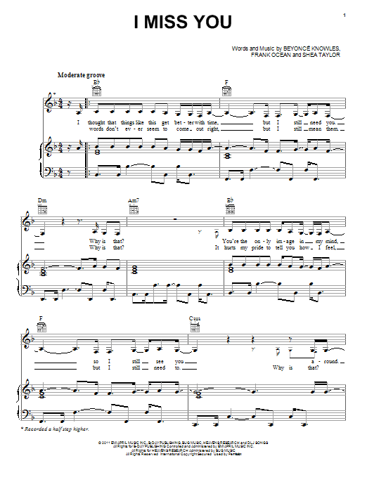 Download or print Beyoncé I Miss You sheet music, chords and digital score arranged for Piano, Vocal & Guitar Chords (Right-Hand Melody). This Pop score includes 4 page(s).