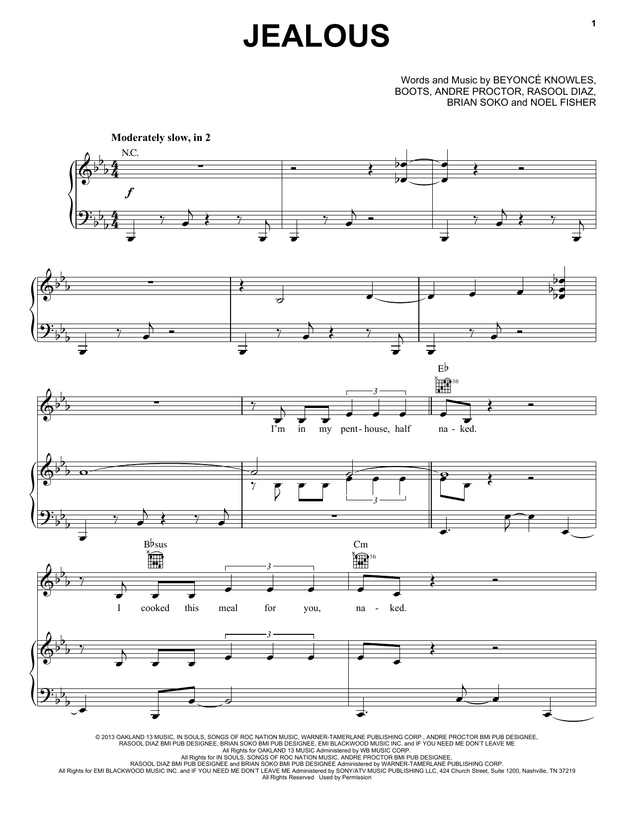 Download or print Beyoncé Jealous sheet music, chords and digital score arranged for Piano, Vocal & Guitar Chords (Right-Hand Melody). This Pop score includes 10 page(s).