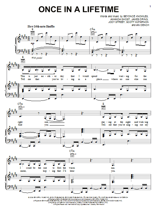 Download or print Beyonce Once In A Lifetime sheet music, chords and digital score arranged for Piano, Vocal & Guitar Chords (Right-Hand Melody). This Film/TV score includes 5 page(s).
