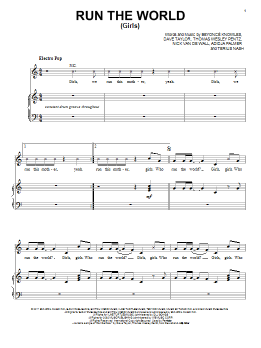 Download or print Beyoncé Run The World (Girls) sheet music, chords and digital score arranged for Piano, Vocal & Guitar Chords (Right-Hand Melody). This Pop score includes 10 page(s).