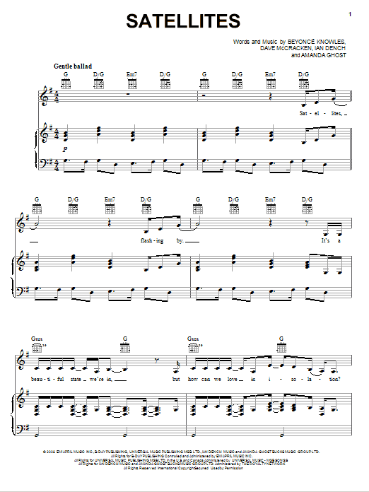 Download or print Beyonce Satellites sheet music, chords and digital score arranged for Piano, Vocal & Guitar Chords (Right-Hand Melody). This Pop score includes 4 page(s).
