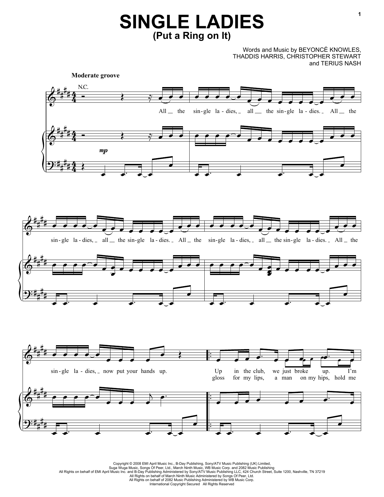 Download or print Beyoncé Single Ladies (Put A Ring On It) sheet music, chords and digital score arranged for Easy Piano. This Pop score includes 7 page(s).