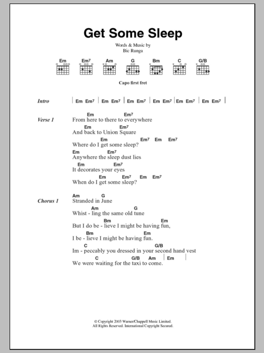 Download or print Bic Runga Get Some Sleep sheet music, chords and digital score arranged for Guitar Chords/Lyrics. This Pop score includes 3 page(s).