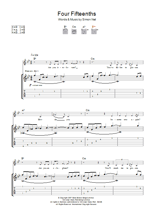 Download or print Biffy Clyro 4/15ths (Four Fifteenths) sheet music, chords and digital score arranged for Guitar Tab. This Rock score includes 2 page(s).
