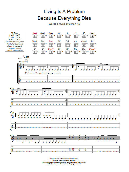 Download or print Biffy Clyro Living Is A Problem Because Everything Dies sheet music, chords and digital score arranged for Guitar Tab. This Rock score includes 8 page(s).