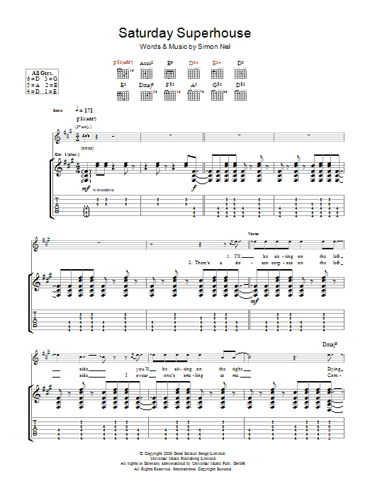 Download or print Biffy Clyro Saturday Superhouse sheet music, chords and digital score arranged for Guitar Chords/Lyrics. This Rock score includes 2 page(s).