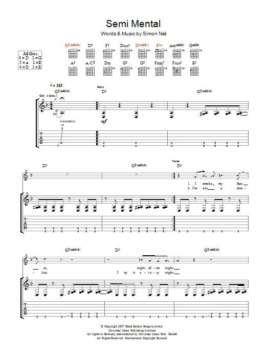 Download or print Biffy Clyro Semi-Mental sheet music, chords and digital score arranged for Guitar Tab. This Rock score includes 5 page(s).