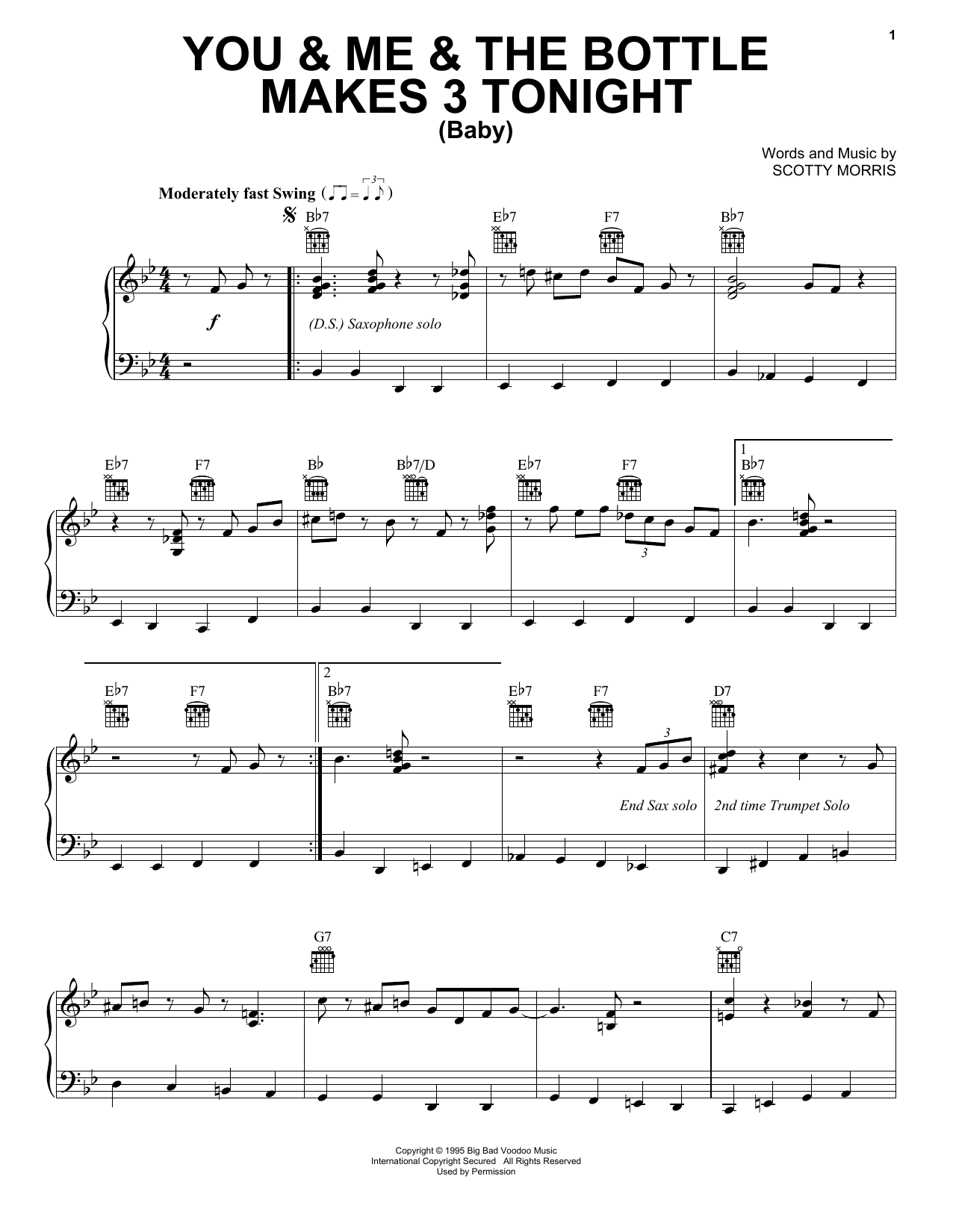 Download or print Big Bad Voodoo Daddy You & Me & The Bottle Makes 3 Tonight (Baby) sheet music, chords and digital score arranged for Piano, Vocal & Guitar Chords (Right-Hand Melody). This Pop score includes 8 page(s).