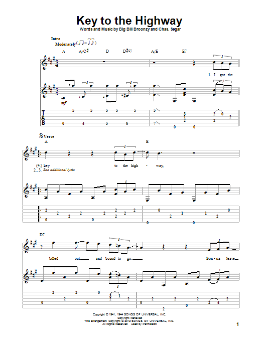 Download or print Big Bill Broonzy Key To The Highway sheet music, chords and digital score arranged for Guitar Tab. This Blues score includes 5 page(s).