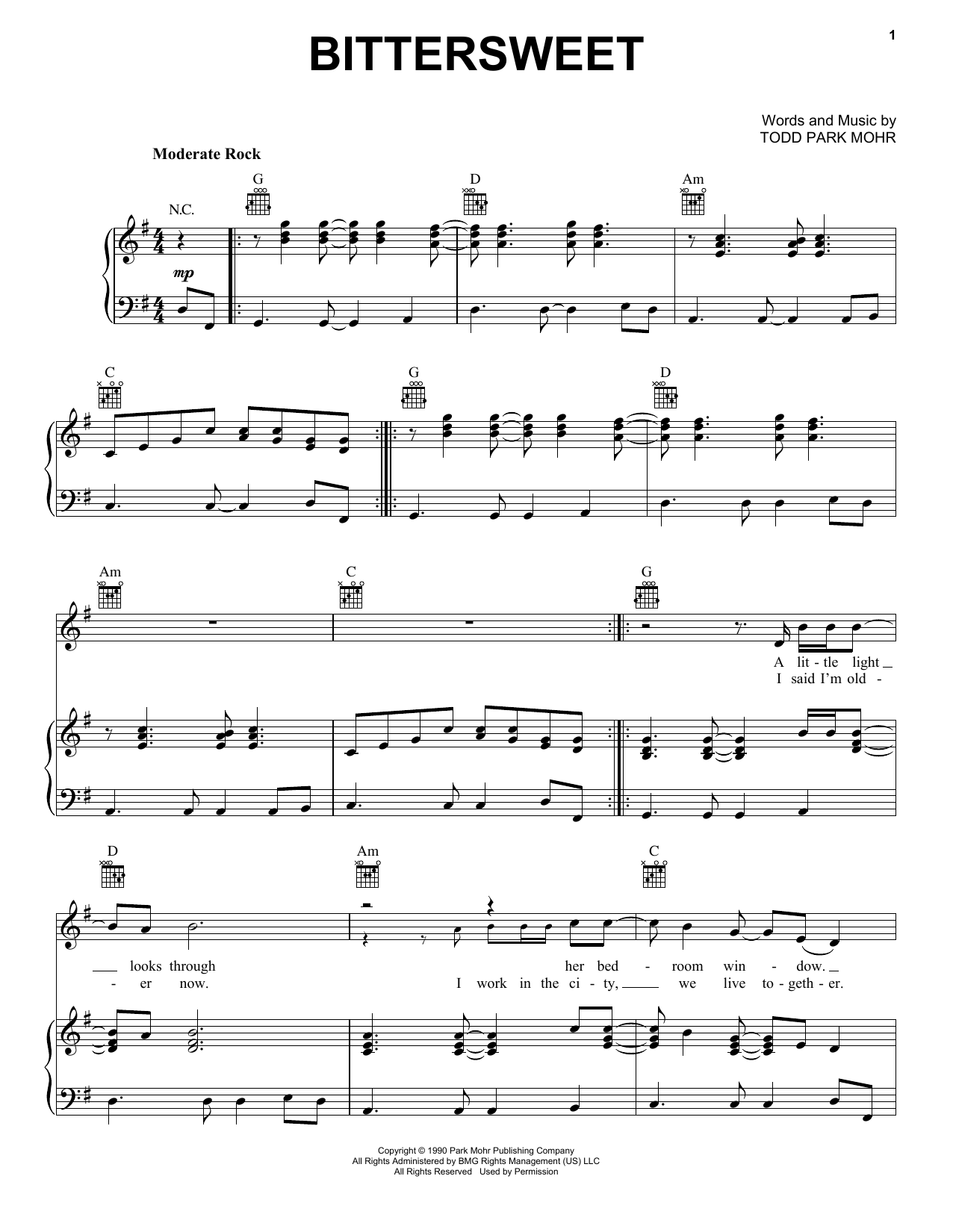 Download or print Big Head Todd & The Monsters Bittersweet sheet music, chords and digital score arranged for Piano, Vocal & Guitar Chords (Right-Hand Melody). This Pop score includes 7 page(s).