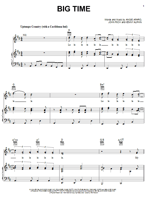 Download or print Big & Rich Big Time sheet music, chords and digital score arranged for Piano, Vocal & Guitar Chords (Right-Hand Melody). This Country score includes 7 page(s).