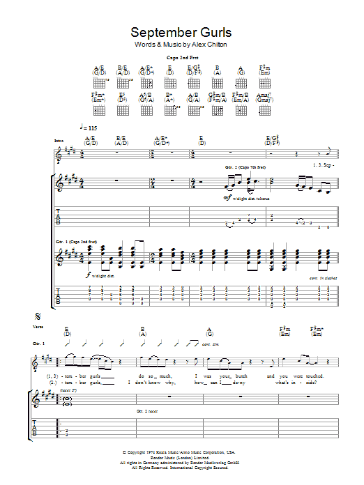 Download or print Big Star September Gurls sheet music, chords and digital score arranged for Guitar Chords/Lyrics. This Pop score includes 2 page(s).