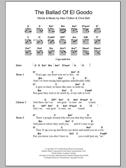 Download or print Big Star The Ballad Of El Goodo sheet music, chords and digital score arranged for Guitar Chords/Lyrics. This Pop score includes 2 page(s).