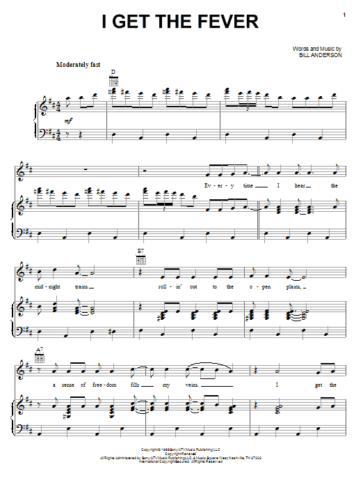 Download or print Bill Anderson I Get The Fever sheet music, chords and digital score arranged for Piano, Vocal & Guitar Chords (Right-Hand Melody). This Country score includes 5 page(s).