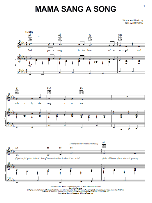 Download or print Bill Anderson Mama Sang A Song sheet music, chords and digital score arranged for Piano, Vocal & Guitar Chords (Right-Hand Melody). This Country score includes 6 page(s).