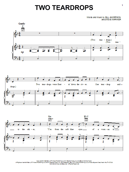 Download or print Bill Anderson Two Teardrops sheet music, chords and digital score arranged for Piano, Vocal & Guitar Chords (Right-Hand Melody). This Country score includes 7 page(s).