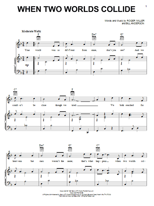 Download or print Bill Anderson When Two Worlds Collide sheet music, chords and digital score arranged for Piano, Vocal & Guitar Chords (Right-Hand Melody). This Country score includes 2 page(s).