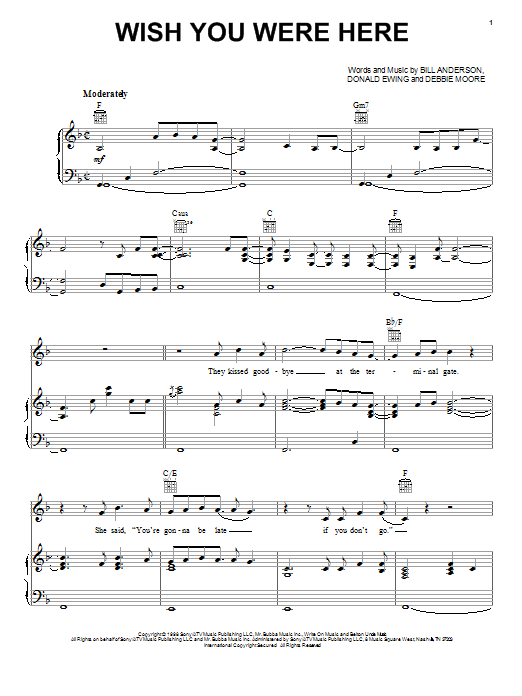 Download or print Bill Anderson Wish You Were Here sheet music, chords and digital score arranged for Piano, Vocal & Guitar Chords (Right-Hand Melody). This Country score includes 7 page(s).