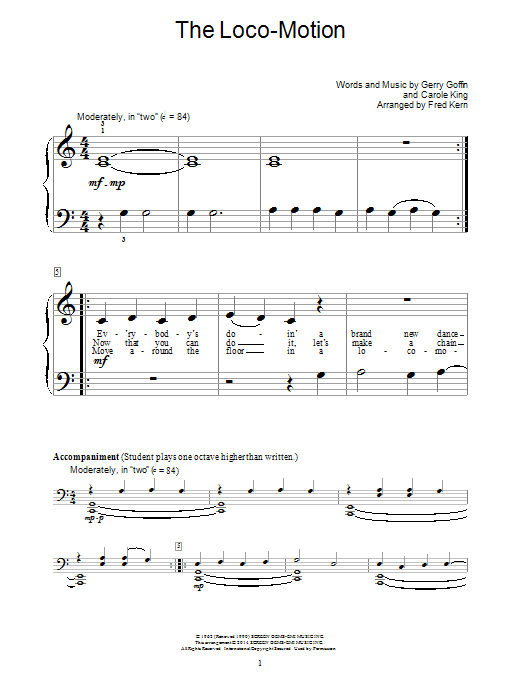 Download or print Little Eva The Loco-Motion (arr. Fred Kern) sheet music, chords and digital score arranged for Educational Piano. This Oldies score includes 5 page(s).