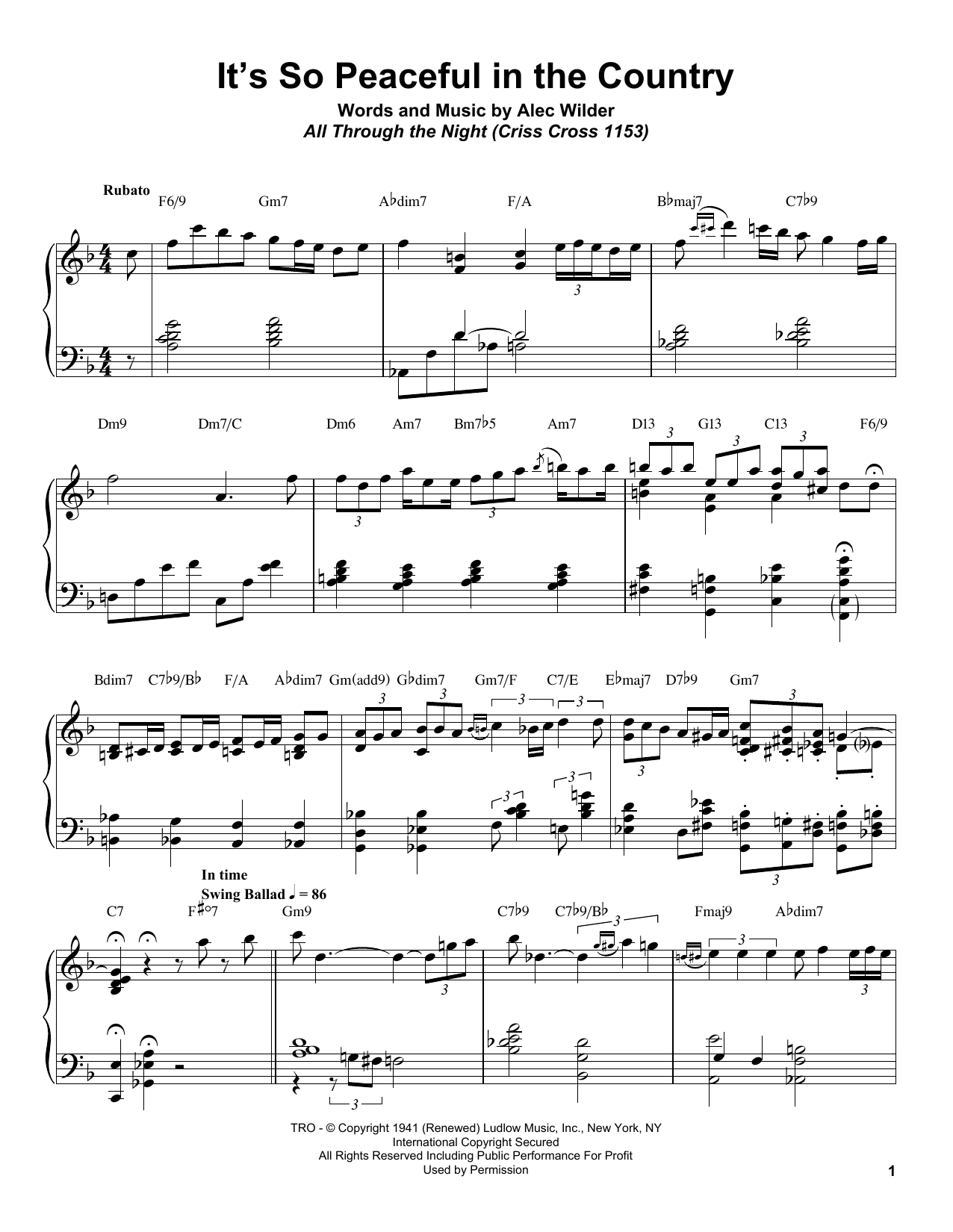 Download or print Bill Charlap It's So Peaceful In The Country sheet music, chords and digital score arranged for Piano Transcription. This Jazz score includes 6 page(s).