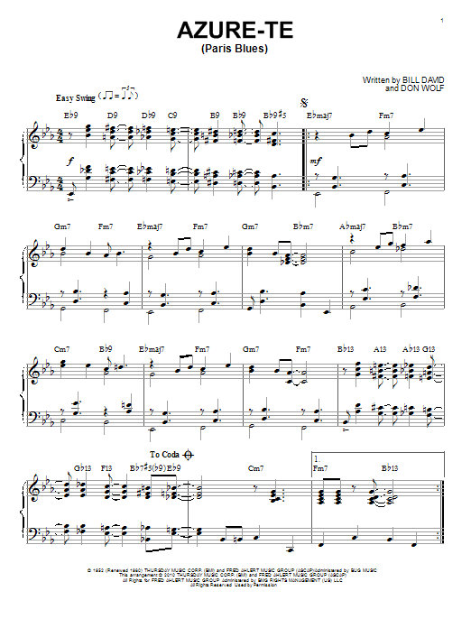 Download or print Bill Davis Azure-Te (Paris Blues) sheet music, chords and digital score arranged for Piano, Vocal & Guitar Chords (Right-Hand Melody). This Jazz score includes 3 page(s).