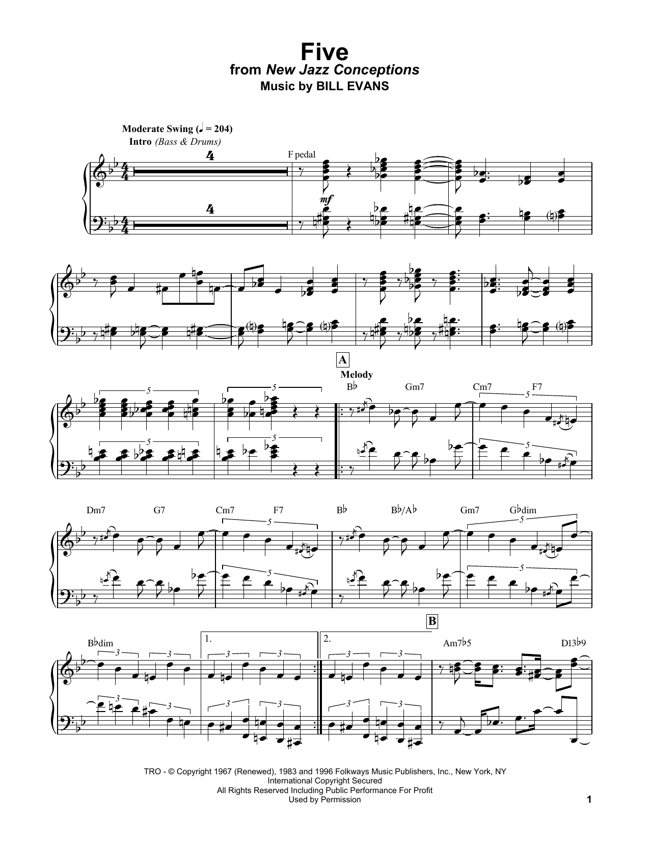 Download or print Bill Evans Five sheet music, chords and digital score arranged for Piano Solo. This Jazz score includes 8 page(s).