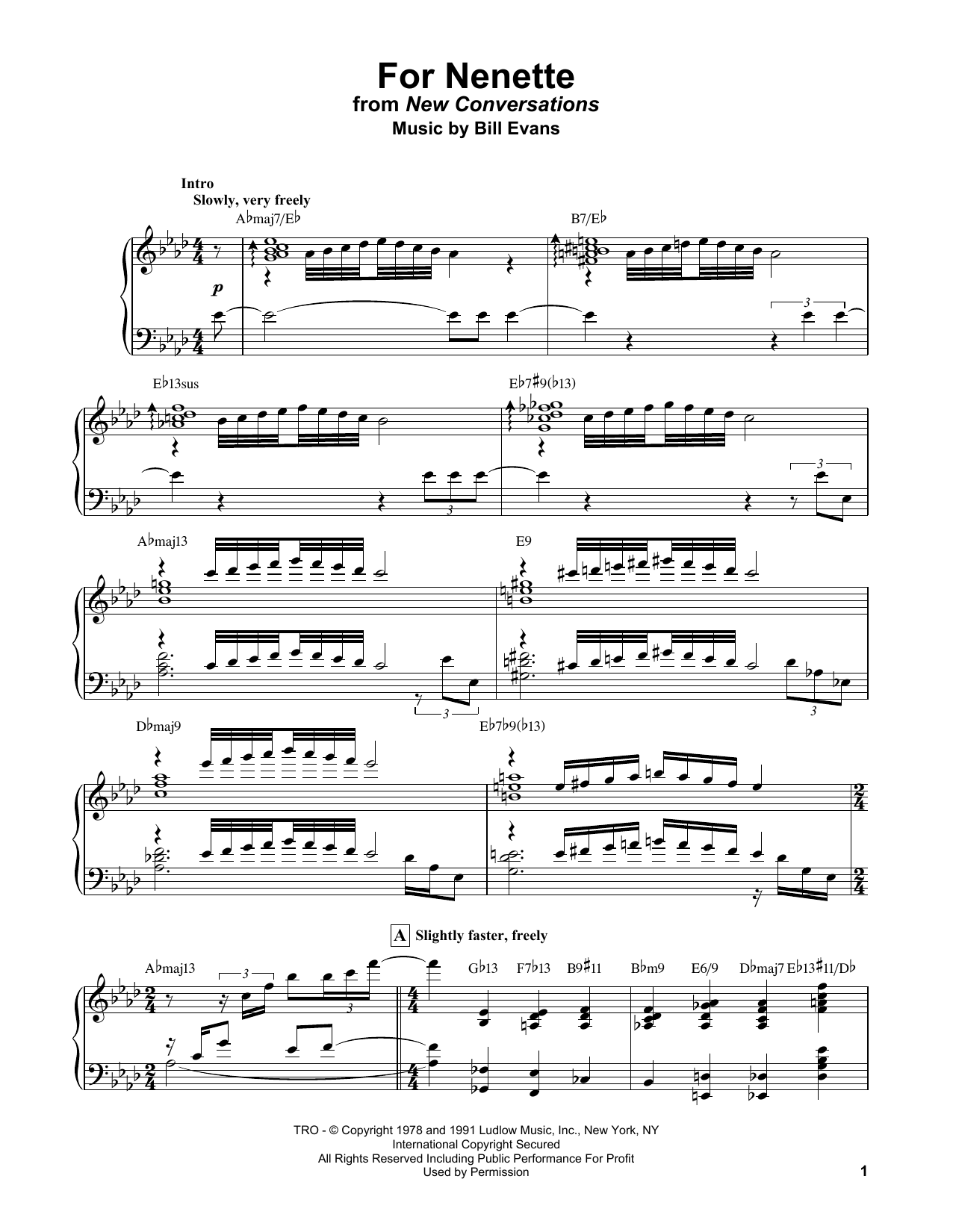Download or print Bill Evans For Nenette sheet music, chords and digital score arranged for Piano Solo. This Jazz score includes 13 page(s).