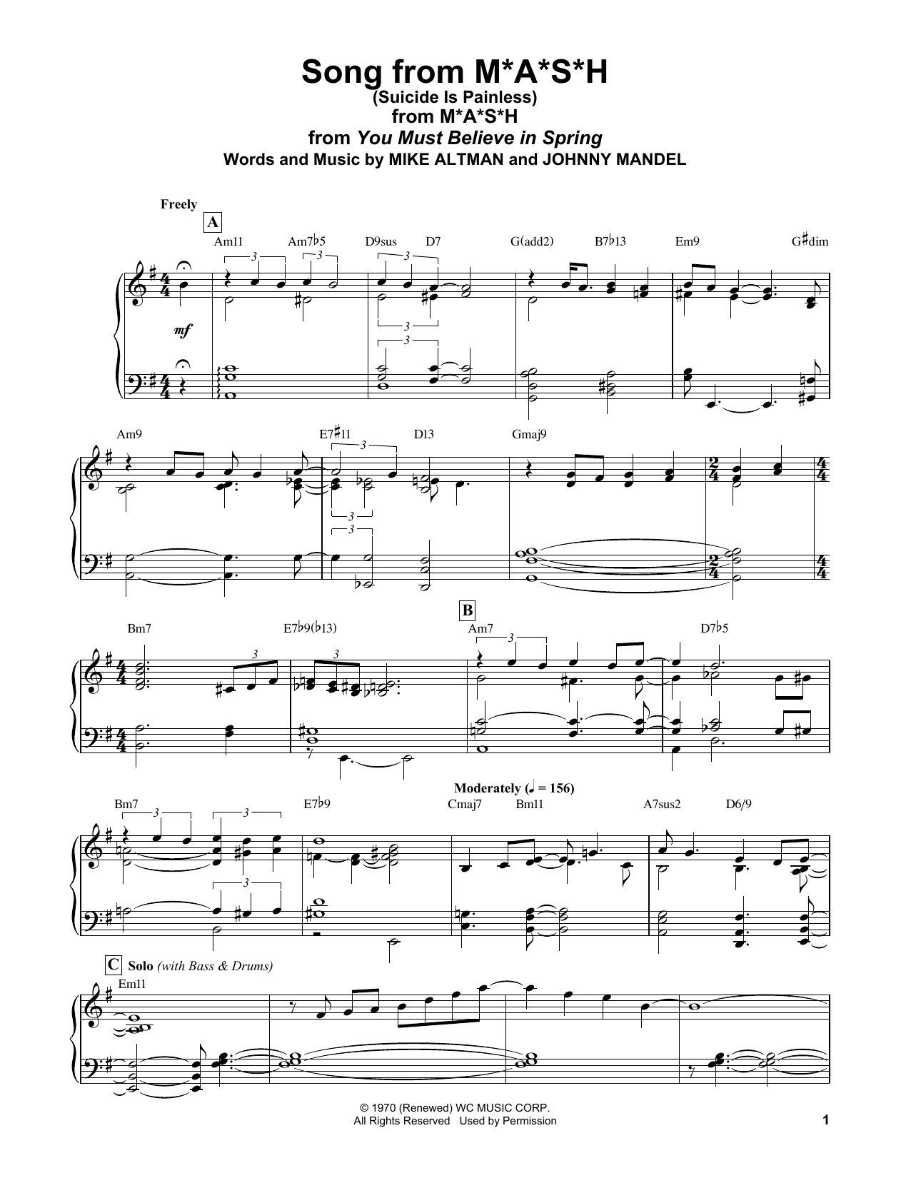 Download or print Bill Evans Song From M*A*S*H (Suicide Is Painless) sheet music, chords and digital score arranged for Piano Solo. This Jazz score includes 11 page(s).